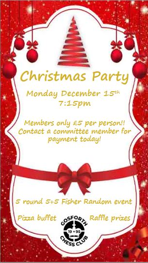 We will holding a fun 5 round 5 minutes plus 5 second Fisher Random tournament with a Pizza Buffet for only £5 per person. You will need to be a paid up member to attend the event.